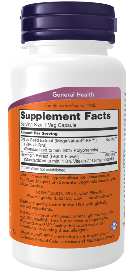 NOW® Blood Pressure Health combines two botanicals well recognized for their cardiovascular benefits.* MegaNatural®-BP™, a patented and clinically tested grape seed extract standardized for polyphenols, contains flavonoids that help support healthy arterial function and assist in maintaining blood pressure already within the normal range.* To further enhance cardiovascular support, NOW® has added standardized hawthorn extract, which provides free radical protection and promotes overall heart health.*