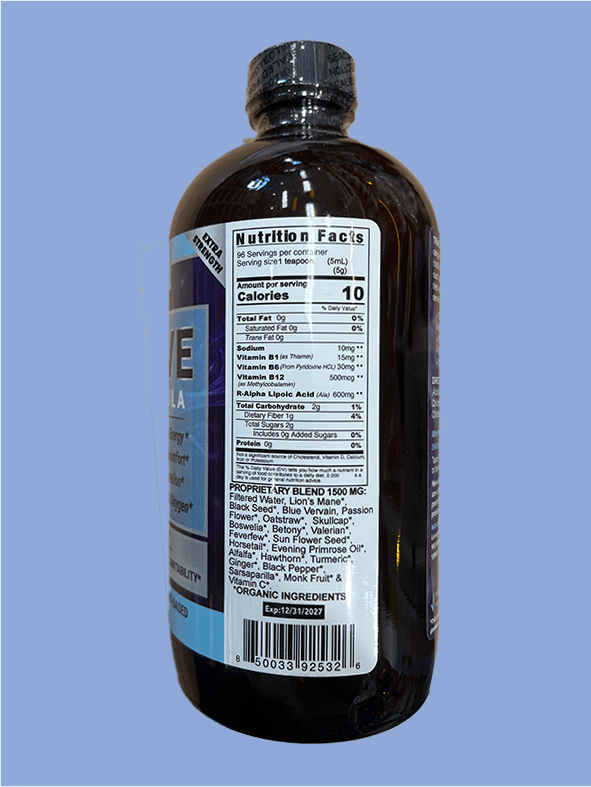 Proprietary Blend 1500 mg: Filtered Water, Lion’s Mane*, Black Seed*, Blue Vervain, Passion Flower*, Oatstraw*, Skullcap*, Boswelia*, Betony*, Valerian*, Feverfew*, Sunflower Seed*, Horsetail*, Evening Primrose Oil*, Alfalfa*, Hawthorn*, Turmeric*, Ginger*, Black Pepper*, Sarsaparilla*, Monk Fruit* and Vitamin C*.