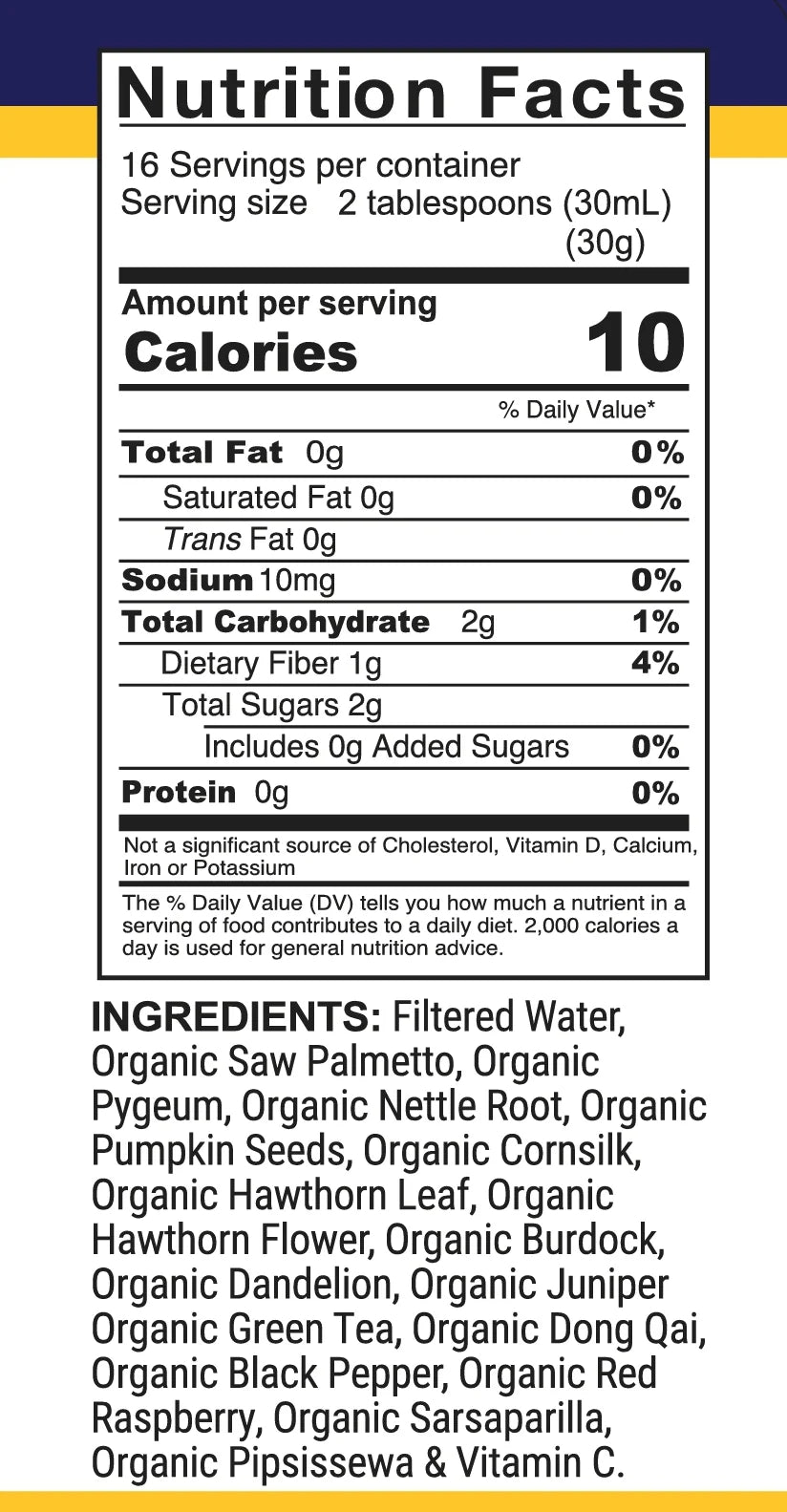 Ingredients: Filtered Water, Organic Saw Palmetto, Organic Pygeum, Organic Nettle Root, Organic Pumpkin Seeds, Organic Cornsilk, Organic Hawthorn Leaf, Organic Hawthorn Flower, Organic Burdock, Organic Dandelion, Organic Juniper, Organic Green Tea, Organic Dong Quai, Organic Black Pepper, Organic Red Raspberry, Organic Sarsaparilla, Organic Pipsissewa & Vitamin C.